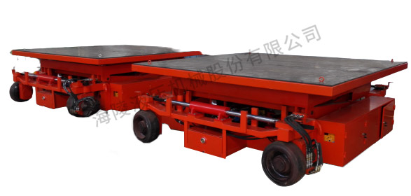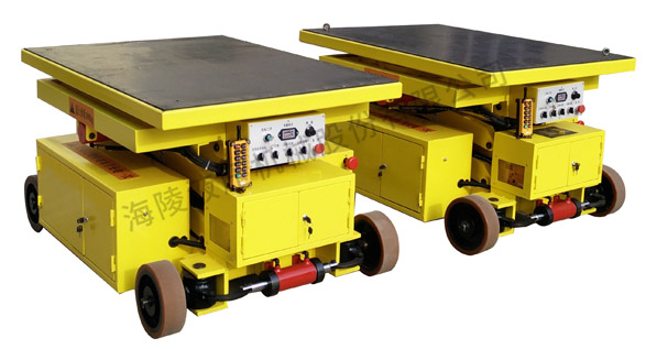 設備組成為液壓泵站驅動的升降平臺,升降平臺上工作臺面可實現前應移動及旋轉,整個平臺可實現縱橫向的行走,由電機驅動實現行走功能,可以自由運行,即能夠實現縱向、橫向。