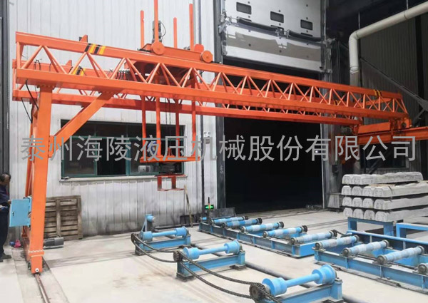 我公司設計制造的碼垛機由行走航架、升降裝置、自動夾緊定位裝置、減速機、電控系統等組成。設備整機為鋼結構件。行走航架通過行走電機驅動減速機帶動鋼軌輪旋轉,該電機帶剎車,可在任意位置剎車并停止行走。